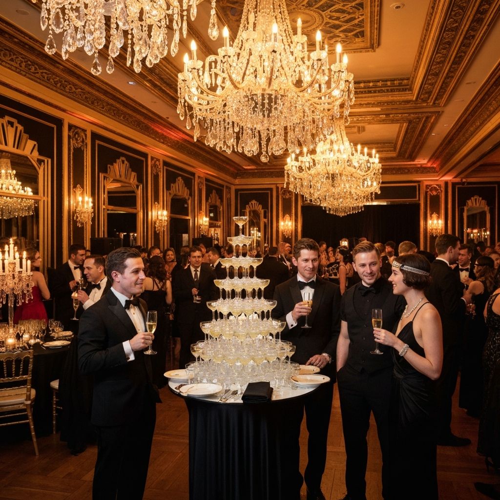 Пренесете се в блестящите 20-те години на миналия век с автентично Гетсби парти! Създаваме луксозна атмосфера с арт деко декорация, златни акценти, пера, перли и елегантност, вдъхновени от легендарните партита на Великия Гетсби.